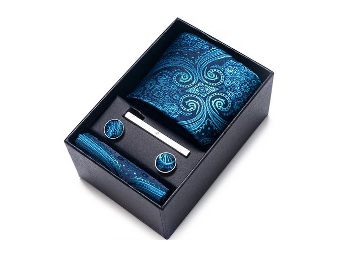 Kravatový set obsahující kravatu, kapesníček, manžety a kravatovou sponu v dárkové krabičce.