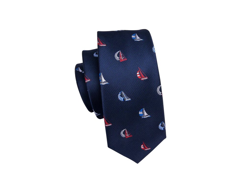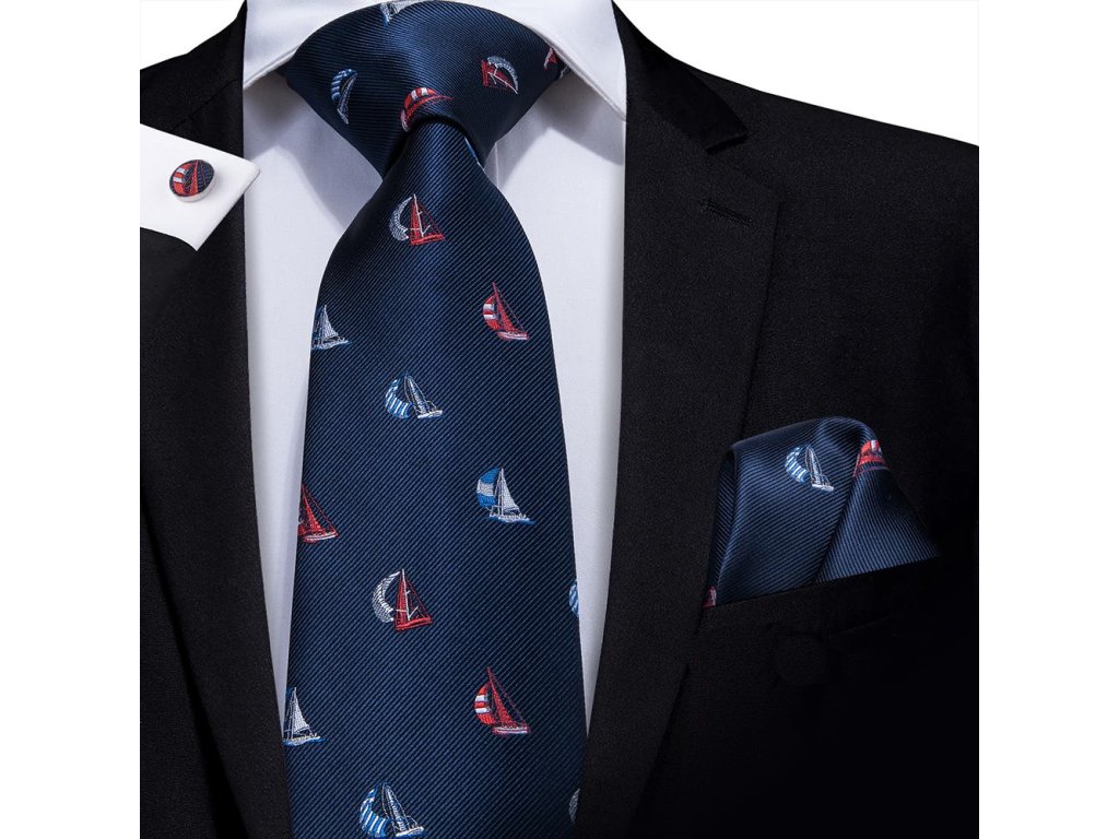 Kravatový set modrý s plachetnicemi, kravata, kapesníček, manžety